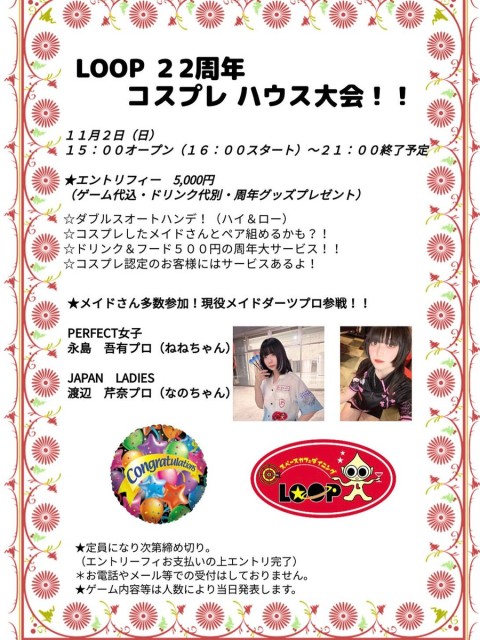 日曜日は㊗️22周年コスプレハウストーナメントの為、通常営業はございません。 ※参加者以外(応援含)ご入場はできません。(席に限りがありますでご了承下さい) ドリンク¥500 ・チョコorナッツ¥500 バターチキンカレー¥1,000 チェキ・キャストドリンク¥1,000  税込・サービス料なし大サービス中♬ https://t.co/ERu3d1Z7cB