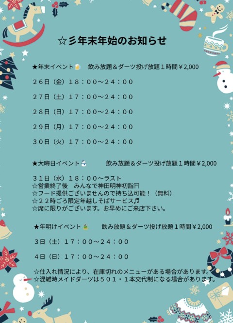 (26日〜4日飲み放題&ダーツ投げ放題)