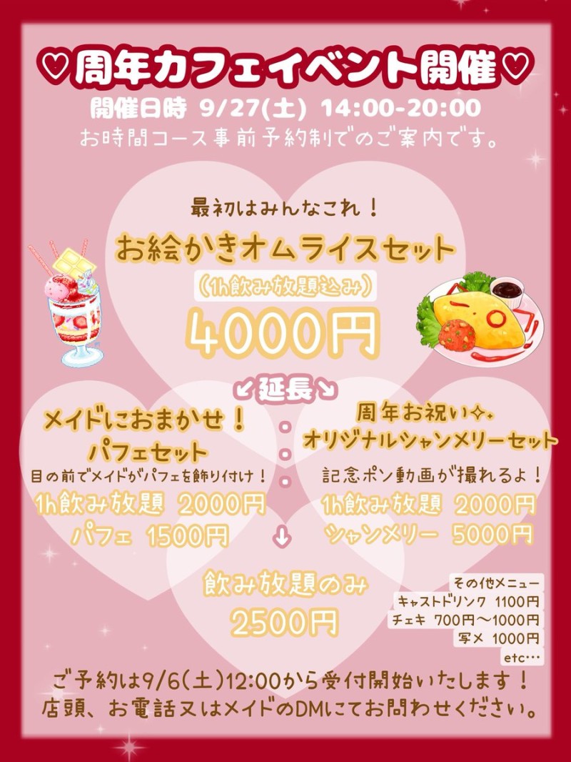 🎊呚幎むベント告知①🎊 おかげさたで圓店はは9月で2呚幎を迎えるこずができたす 2呚幎蚘念しおカフェむベントを開催したす☕💐 📅9月27日(土) 📍旧JOKER(予定) 🕑14:00-20:00 詳现はメむドにお尋ねくださいたせ。 ご予玄は9/6(土)より受付開始臎したすご参加心よりお埅ちしおたす♡ https://t.co/qe4fQrnN3V