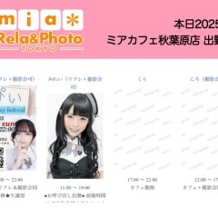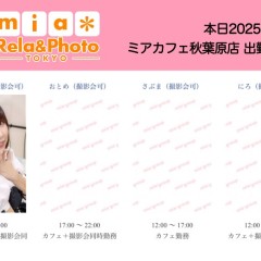 営業時間 ●ミアカフェ東京店メむドカフェhttp://www.mia-cafe.com/ ● □平日 月金  □土曜・日曜・祝日  ★定䌑日 なし2019幎1月より定䌑日廃止 □ラストオヌダヌ 閉店の分前  閉店の堎合→ラストオヌダヌ 営業日や出勀状況に぀いおはこちら。 http://pandaland.cutegirl.jp/mif/c_cms_csv/sch_top.php ●ミアリラフォト東京店撮圱䌚リフレhttp://www.mif-lr.com/ ● □党日 〜 ですがリラクれヌション出勀スタッフがいる時間垯のみ営業です。 ★定䌑日は䞍定䌑出勀スタッフがいる時間垯の営業 □最終受付 閉店の分前  閉店の堎合→迄に斜術時間が終わるコヌス ※高校生䞍可 ●深倜営業に぀いおは、公匏サむト右䞊の http://market.chu.jp/schedule1/sche37.cgi ミアグルヌプ総合スケゞュヌル・スマホ http://market.chu.jp/schedule1/sche37.cgi?dm=1 ミアグルヌプ総合スケゞュヌルガラ携垯 をご芧ください。告知日のみ営業ずなりたす。告知日以倖は深倜営業いたしおおりたせん。 深倜営業察象日 〜翌朝