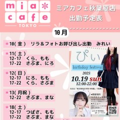 ★#メむドカフェ ・ #ミアカフェ #秋葉原 店★ ☕営業予定日☕ 🎀10月10日(金)  リラフォトお呌び出し出勀 みれい 🎀10月11日(土)  12-17 くら、もも  17-22 さぶた、にろ 🎀10月12日(日)  12-17 にろ、もも  17-22 くら、さぶた 🎀10月13日(月祝)  12-22 さぶた、たな #コンカフェ営業 https://t.co/eZCg08dV86