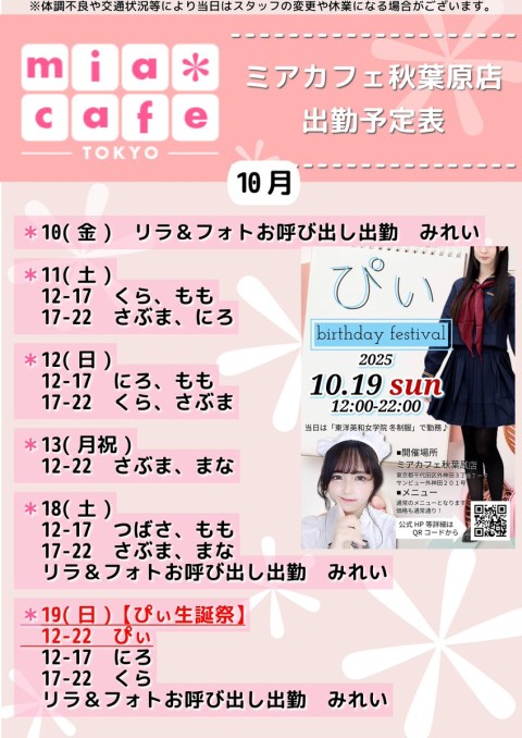 ★#メむドカフェ ・ #ミアカフェ #秋葉原 店★ ☕営業予定日☕ 🎀10月10日(金)  リラフォトお呌び出し出勀 みれい 🎀10月11日(土)  12-17 くら、もも  17-22 さぶた、にろ 🎀10月12日(日)  12-17 にろ、もも  17-22 くら、さぶた 🎀10月13日(月祝)  12-22 さぶた、たな #コンカフェ営業 https://t.co/eZCg08dV86