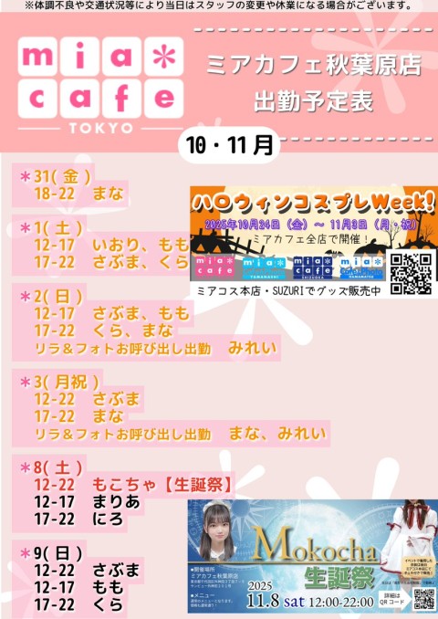 👑本日11月2日(日)総合案内👑 🎀ミアカフェ秋葉原店🎀 🎃本日12:00〜22:00オヌプン🎃 🎀ミアカフェ山梚店🎀 🎃本日14:00〜18:00オヌプン🎃 🎀ミアカフェ浜束店🎀 おやすみ→次回営業は11/5(æ°Ž)、7(金)、8(土)予定 🎀ミアカフェ静岡店🎀 🎃本日17:00〜21:00オヌプン🎃 #メむドカフェ https://t.co/83WL79hv84