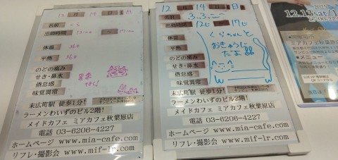 | 営業時間 | ●ミアカフェ東京店(メイドカフェ)http://www.mia-cafe.com/ ● □平日 月~金 17:00~22:00 □土曜・日曜・祝日 12:00~22:00 ★定休日 なし(2019年1月より定休日廃止) □ラストオーダー 閉店の60分前 22:00閉店の場合→21:00ラストオーダー 営業日や出勤状況についてはこちら。 http://pandaland.cutegirl.jp/mif/c_cms_csv/sch_top.php ●ミアリラ&フォト東京店(撮影会&リフレ)http://www.mif-lr.com/ ● □全日 12:00〜22:00 ですがリラクゼーション出勤スタッフがいる時間帯のみ営業です。 ★定休日は不定休(出勤スタッフがいる時間帯の営業) □最終受付 閉店の45分前 22:00閉店の場合→21:15(21:50迄に施術時間が終わるコース) ※高校生不可 ●深夜営業については、公式サイト右上の http://market.chu.jp/schedule1/sche37.cgi ミアグループ総合スケジュール(PC・スマホ) http://market.chu.jp/schedule1/sche37.cgi?dm=1 ミアグループ総合スケジュール(ガラ携帯) をご覧ください。告知日のみ営業となります。告知日以外は深夜営業いたしておりません。 深夜営業対象日 22:00〜翌朝5:00(L.O.4:00) | ||||||||||||||