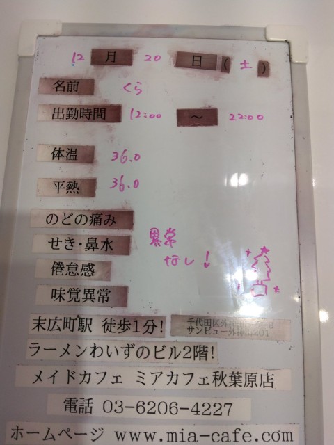 | 営業時間 | ●ミアカフェ東京店(メイドカフェ)http://www.mia-cafe.com/ ● □平日 月~金 17:00~22:00 □土曜・日曜・祝日 12:00~22:00 ★定休日 なし(2019年1月より定休日廃止) □ラストオーダー 閉店の60分前 22:00閉店の場合→21:00ラストオーダー 営業日や出勤状況についてはこちら。 http://pandaland.cutegirl.jp/mif/c_cms_csv/sch_top.php ●ミアリラ&フォト東京店(撮影会&リフレ)http://www.mif-lr.com/ ● □全日 12:00〜22:00 ですがリラクゼーション出勤スタッフがいる時間帯のみ営業です。 ★定休日は不定休(出勤スタッフがいる時間帯の営業) □最終受付 閉店の45分前 22:00閉店の場合→21:15(21:50迄に施術時間が終わるコース) ※高校生不可 ●深夜営業については、公式サイト右上の http://market.chu.jp/schedule1/sche37.cgi ミアグループ総合スケジュール(PC・スマホ) http://market.chu.jp/schedule1/sche37.cgi?dm=1 ミアグループ総合スケジュール(ガラ携帯) をご覧ください。告知日のみ営業となります。告知日以外は深夜営業いたしておりません。 深夜営業対象日 22:00〜翌朝5:00(L.O.4:00) | ||||||||||||||