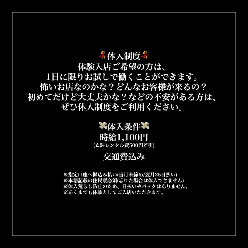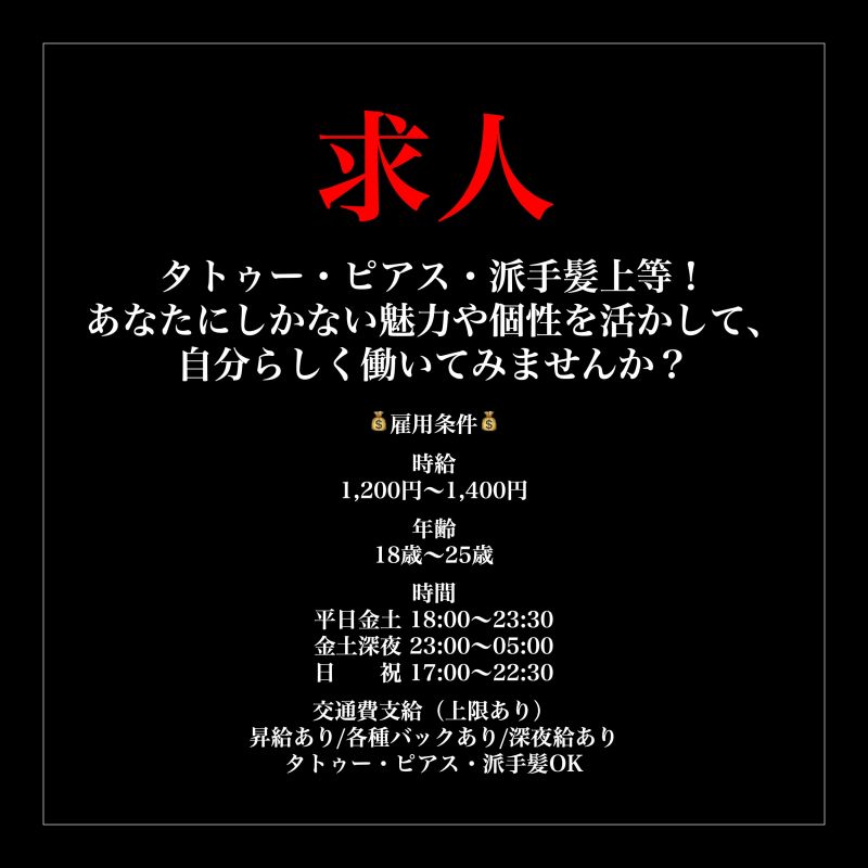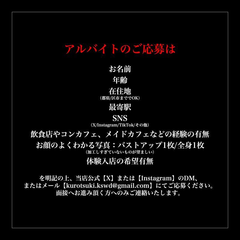 ããŸãïŒã  ð³æ³šç®ãã€ã³ãð³ ã»å¶æ¥DMããªããŠOKïŒ ã»ããããœãããªããŠOKïŒ ã»æ¥åºäºå®ããªããŠãã·ããã€ã³å¯ïŒ ã»å®å¿ã®ã¢ã«ãã€ãéçšïŒ ã»æçµŠå®å šä¿èšŒïŒ ð°éçšæ¡ä»¶ð° æçµŠïŒ1,200åïœ1,400å 幎霢ïŒ18æ³ïœ28æ³ æéïŒååã·ãã 18:00ã23:30/åŸåã·ãã 23:00ã05:00 亀éè²»æ¯çµŠïŒäžéããïŒ æçµŠãã/åçš®ããã¯ãã/æ·±å€çµŠãã ã¿ãã¥ãŒã»ãã¢ã¹ã»æŽŸæé«ªOK ð³æ³šç®ãã€ã³ãð³ ã»å¶æ¥DMããªããŠOKïŒ ã»ããããœãããªããŠOKïŒ ã»æ¥åºäºå®ããªããŠãã·ããã€ã³å¯ïŒ ã»å®å¿ã®ã¢ã«ãã€ãéçšïŒ ã»æçµŠå®å šä¿èšŒïŒ ðäœå ¥å¶åºŠð äœéšå ¥åºãåžæã®æ¹ã¯ã1æ¥ã«éãã詊ãã§åãããšãã§ããŸããæããåºãªã®ããªïŒã©ããªã客æ§ãæ¥ãã®ïŒåããŠã ãã©å€§äžå€«ããªïŒãªã©ã®äžå®ãããæ¹ã¯ããã²äœå ¥å¶åºŠããå©çšãã ããã ðžäœå ¥æ¡ä»¶ðž æçµŠ1,100å(è¡£è£ ã¬ã³ã¿ã«è²»500åå·®åŒ) 亀é費蟌㿠â ïžæå®å£åº§ãžæ¯èŸŒã¿æã(åœææ«ç· ã/ç¿æ25æ¥æã) â ïžæ¬ç±èšèŒã®äœæ°ç¥šå¿ é (å¿ããå Žåã¯äœå ¥ã§ããŸãã) â ïžäœå ¥èãã鲿¢ã®ãããæ¥æããããã¯ã¯ãããŸããã â ïžãããŸã§ãäœéšãšããŠãå ¥åºããã ããŸãã ã¢ã«ãã€ãã®ãå¿åã¯ã ã»ãåå ã»å¹Žéœ¢ ã»åšäœå°ïŒéœç/åºåžãŸã§ã§OKïŒ ã»æå¯é§ ã»SNSïŒX/Instagram/TikTok/ãã®ä»ïŒ ã»é£²é£åºãã³ã³ã«ãã§ãã¡ã€ãã«ãã§ãªã©ã®çµéšã®æç¡ ã»ãé¡ã®ãããããåçïŒãã¹ãã¢ãã1æ/å šèº«1æïŒå å·¥ããããŠããªããã®ãæãŸããïŒ ã»äœéšå ¥åºã®åžææç¡ ãæèšã®äžãåœåºå ¬åŒãXããŸãã¯ãInstagramãã®DMããŸãã¯ã¡ãŒã«ã kurotsuki.kswd@gmail.com ãã«ãŠãå¿åãã ããã颿¥ãžãé²ã¿é ãæ¹ãžã®ã¿ãé£çµ¡ããããŸãã  |