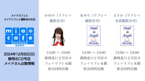 | 営業時間 | 静岡店は出勤スタッフがいれば営業です! 基本的に 12時~22時が営業時間です! ●静岡店のツイッター @shizuokamaidsan https://twitter.com/shizuokamaidsan ●ミア静岡店の営業曜日&営業時間● ☆月〜木 14:00〜22:00(最終受付20:00) ☆金曜日 12:00〜22:00(最終受付21:00) ☆土・日・祝 12:00〜22:00(最終受付21:00) 営業時間外はオンライン予約にてお願いいたします。 PC・携帯共通 → http://m-kanzume.moo.jp/yoyaku2/user.cgi ●ミアガイド出勤状況● スマホ・PC → 後日公開予定 ★静岡店スタッフによるミア甲府店でのメイドカフェリアル営業★ ☆不定期 サイトにてご確認ください。 http://market.chu.jp/schedule1/sche37.cgi | ||||||||||||||