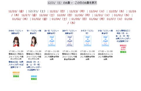 | 営業時間 | 静岡店は出勤スタッフがいれば営業です! 基本的に 12時~22時が営業時間です! ●静岡店のツイッター @shizuokamaidsan https://twitter.com/shizuokamaidsan ●ミア静岡店の営業曜日&営業時間● ☆月〜木 14:00〜22:00(最終受付20:00) ☆金曜日 12:00〜22:00(最終受付21:00) ☆土・日・祝 12:00〜22:00(最終受付21:00) 営業時間外はオンライン予約にてお願いいたします。 PC・携帯共通 → http://m-kanzume.moo.jp/yoyaku2/user.cgi ●ミアガイド出勤状況● スマホ・PC → 後日公開予定 ★静岡店スタッフによるミア甲府店でのメイドカフェリアル営業★ ☆不定期 サイトにてご確認ください。 http://market.chu.jp/schedule1/sche37.cgi | ||||||||||||||