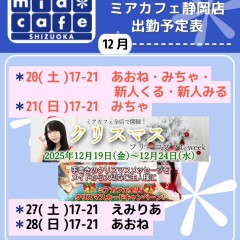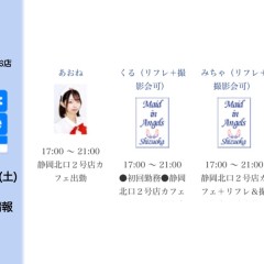 | 営業時間 | 静岡店は出勤スタッフがいれば営業です! 基本的に 12時~22時が営業時間です! ●静岡店のツイッター @shizuokamaidsan https://twitter.com/shizuokamaidsan ●ミア静岡店の営業曜日&営業時間● ☆月〜木 14:00〜22:00(最終受付20:00) ☆金曜日 12:00〜22:00(最終受付21:00) ☆土・日・祝 12:00〜22:00(最終受付21:00) 営業時間外はオンライン予約にてお願いいたします。 PC・携帯共通 → http://m-kanzume.moo.jp/yoyaku2/user.cgi ●ミアガイド出勤状況● スマホ・PC → 後日公開予定 ★静岡店スタッフによるミア甲府店でのメイドカフェリアル営業★ ☆不定期 サイトにてご確認ください。 http://market.chu.jp/schedule1/sche37.cgi | ||||||||||||||