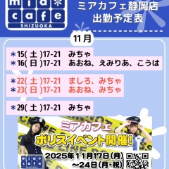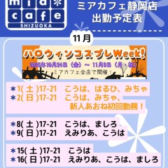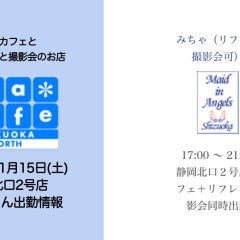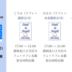 | 営業時間 | 静岡店は出勤スタッフがいれば営業です! 基本的に 12時~22時が営業時間です! ●静岡店のツイッター @shizuokamaidsan https://twitter.com/shizuokamaidsan ●ミア静岡店の営業曜日&営業時間● ☆月〜木 14:00〜22:00(最終受付20:00) ☆金曜日 12:00〜22:00(最終受付21:00) ☆土・日・祝 12:00〜22:00(最終受付21:00) 営業時間外はオンライン予約にてお願いいたします。 PC・携帯共通 → http://m-kanzume.moo.jp/yoyaku2/user.cgi ●ミアガイド出勤状況● スマホ・PC → 後日公開予定 ★静岡店スタッフによるミア甲府店でのメイドカフェリアル営業★ ☆不定期 サイトにてご確認ください。 http://market.chu.jp/schedule1/sche37.cgi | ||||||||||||||