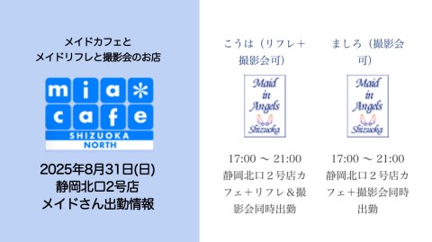 | 営業時間 | 静岡店は出勤スタッフがいれば営業です! 基本的に 12時~22時が営業時間です! ●静岡店のツイッター @shizuokamaidsan https://twitter.com/shizuokamaidsan ●ミア静岡店の営業曜日&営業時間● ☆月〜木 14:00〜22:00(最終受付20:00) ☆金曜日 12:00〜22:00(最終受付21:00) ☆土・日・祝 12:00〜22:00(最終受付21:00) 営業時間外はオンライン予約にてお願いいたします。 PC・携帯共通 → http://m-kanzume.moo.jp/yoyaku2/user.cgi ●ミアガイド出勤状況● スマホ・PC → 後日公開予定 ★静岡店スタッフによるミア甲府店でのメイドカフェリアル営業★ ☆不定期 サイトにてご確認ください。 http://market.chu.jp/schedule1/sche37.cgi | ||||||||||||||
