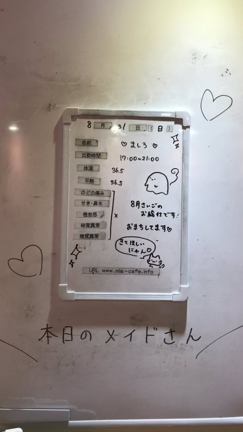 | 営業時間 | 静岡店は出勤スタッフがいれば営業です! 基本的に 12時~22時が営業時間です! ●静岡店のツイッター @shizuokamaidsan https://twitter.com/shizuokamaidsan ●ミア静岡店の営業曜日&営業時間● ☆月〜木 14:00〜22:00(最終受付20:00) ☆金曜日 12:00〜22:00(最終受付21:00) ☆土・日・祝 12:00〜22:00(最終受付21:00) 営業時間外はオンライン予約にてお願いいたします。 PC・携帯共通 → http://m-kanzume.moo.jp/yoyaku2/user.cgi ●ミアガイド出勤状況● スマホ・PC → 後日公開予定 ★静岡店スタッフによるミア甲府店でのメイドカフェリアル営業★ ☆不定期 サイトにてご確認ください。 http://market.chu.jp/schedule1/sche37.cgi | ||||||||||||||