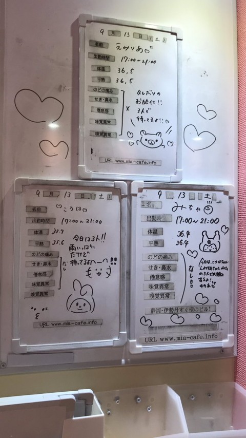 | 営業時間 | 静岡店は出勤スタッフがいれば営業です! 基本的に 12時~22時が営業時間です! ●静岡店のツイッター @shizuokamaidsan https://twitter.com/shizuokamaidsan ●ミア静岡店の営業曜日&営業時間● ☆月〜木 14:00〜22:00(最終受付20:00) ☆金曜日 12:00〜22:00(最終受付21:00) ☆土・日・祝 12:00〜22:00(最終受付21:00) 営業時間外はオンライン予約にてお願いいたします。 PC・携帯共通 → http://m-kanzume.moo.jp/yoyaku2/user.cgi ●ミアガイド出勤状況● スマホ・PC → 後日公開予定 ★静岡店スタッフによるミア甲府店でのメイドカフェリアル営業★ ☆不定期 サイトにてご確認ください。 http://market.chu.jp/schedule1/sche37.cgi | ||||||||||||||