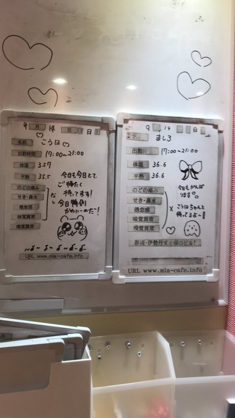 | 営業時間 | 静岡店は出勤スタッフがいれば営業です! 基本的に 12時~22時が営業時間です! ●静岡店のツイッター @shizuokamaidsan https://twitter.com/shizuokamaidsan ●ミア静岡店の営業曜日&営業時間● ☆月〜木 14:00〜22:00(最終受付20:00) ☆金曜日 12:00〜22:00(最終受付21:00) ☆土・日・祝 12:00〜22:00(最終受付21:00) 営業時間外はオンライン予約にてお願いいたします。 PC・携帯共通 → http://m-kanzume.moo.jp/yoyaku2/user.cgi ●ミアガイド出勤状況● スマホ・PC → 後日公開予定 ★静岡店スタッフによるミア甲府店でのメイドカフェリアル営業★ ☆不定期 サイトにてご確認ください。 http://market.chu.jp/schedule1/sche37.cgi | ||||||||||||||