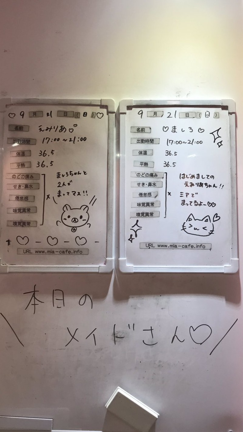 営業時間 | 静岡店は出勤スタッフがいれば営業です! 基本的に 12時~22時が営業時間です! ●静岡店のツイッター @shizuokamaidsan https://twitter.com/shizuokamaidsan ●ミア静岡店の営業曜日&営業時間● ☆月〜木 14:00〜22:00(最終受付20:00) ☆金曜日 12:00〜22:00(最終受付21:00) ☆土・日・祝 12:00〜22:00(最終受付21:00) 営業時間外はオンライン予約にてお願いいたします。 PC・携帯共通 → http://m-kanzume.moo.jp/yoyaku2/user.cgi ●ミアガイド出勤状況● スマホ・PC → 後日公開予定 ★静岡店スタッフによるミア甲府店でのメイドカフェリアル営業★ ☆不定期 サイトにてご確認ください。 http://market.chu.jp/schedule1/sche37.cgi | ||||||||||||||