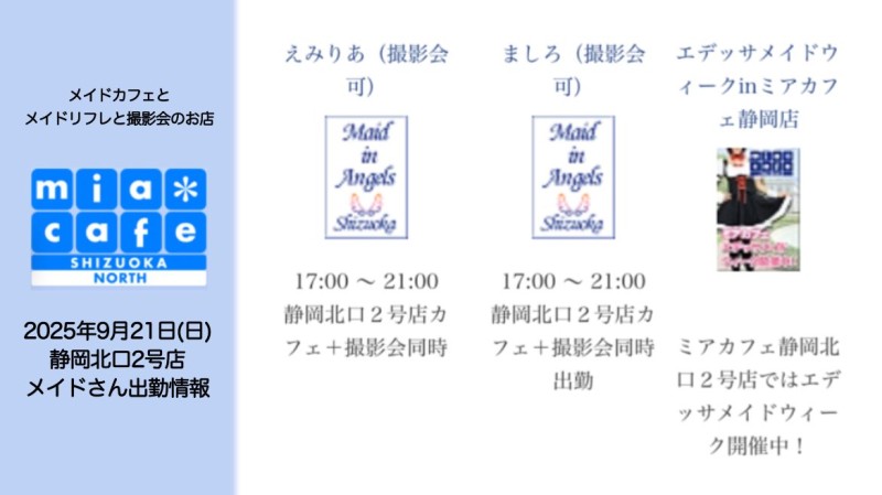 営業時間 | 静岡店は出勤スタッフがいれば営業です! 基本的に 12時~22時が営業時間です! ●静岡店のツイッター @shizuokamaidsan https://twitter.com/shizuokamaidsan ●ミア静岡店の営業曜日&営業時間● ☆月〜木 14:00〜22:00(最終受付20:00) ☆金曜日 12:00〜22:00(最終受付21:00) ☆土・日・祝 12:00〜22:00(最終受付21:00) 営業時間外はオンライン予約にてお願いいたします。 PC・携帯共通 → http://m-kanzume.moo.jp/yoyaku2/user.cgi ●ミアガイド出勤状況● スマホ・PC → 後日公開予定 ★静岡店スタッフによるミア甲府店でのメイドカフェリアル営業★ ☆不定期 サイトにてご確認ください。 http://market.chu.jp/schedule1/sche37.cgi | ||||||||||||||