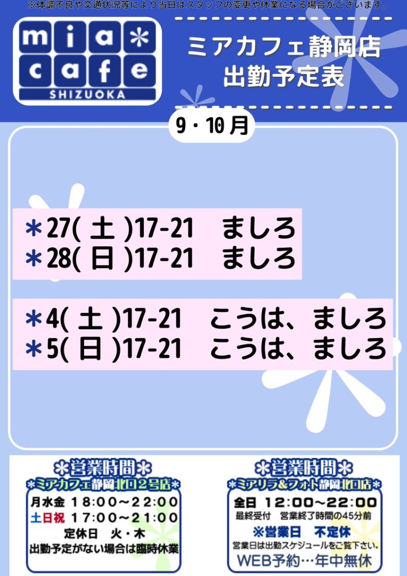 営業時間 | 静岡店は出勤スタッフがいれば営業です! 基本的に 12時~22時が営業時間です! ●静岡店のツイッター @shizuokamaidsan https://twitter.com/shizuokamaidsan ●ミア静岡店の営業曜日&営業時間● ☆月〜木 14:00〜22:00(最終受付20:00) ☆金曜日 12:00〜22:00(最終受付21:00) ☆土・日・祝 12:00〜22:00(最終受付21:00) 営業時間外はオンライン予約にてお願いいたします。 PC・携帯共通 → http://m-kanzume.moo.jp/yoyaku2/user.cgi ●ミアガイド出勤状況● スマホ・PC → 後日公開予定 ★静岡店スタッフによるミア甲府店でのメイドカフェリアル営業★ ☆不定期 サイトにてご確認ください。 http://market.chu.jp/schedule1/sche37.cgi | ||||||||||||||