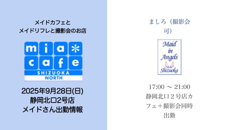 営業時間 | 静岡店は出勤スタッフがいれば営業です! 基本的に 12時~22時が営業時間です! ●静岡店のツイッター @shizuokamaidsan https://twitter.com/shizuokamaidsan ●ミア静岡店の営業曜日&営業時間● ☆月〜木 14:00〜22:00(最終受付20:00) ☆金曜日 12:00〜22:00(最終受付21:00) ☆土・日・祝 12:00〜22:00(最終受付21:00) 営業時間外はオンライン予約にてお願いいたします。 PC・携帯共通 → http://m-kanzume.moo.jp/yoyaku2/user.cgi ●ミアガイド出勤状況● スマホ・PC → 後日公開予定 ★静岡店スタッフによるミア甲府店でのメイドカフェリアル営業★ ☆不定期 サイトにてご確認ください。 http://market.chu.jp/schedule1/sche37.cgi | ||||||||||||||