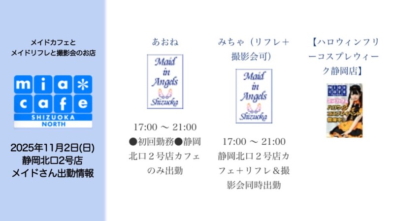 | 営業時間 | 静岡店は出勤スタッフがいれば営業です! 基本的に 12時~22時が営業時間です! ●静岡店のツイッター @shizuokamaidsan https://twitter.com/shizuokamaidsan ●ミア静岡店の営業曜日&営業時間● ☆月〜木 14:00〜22:00(最終受付20:00) ☆金曜日 12:00〜22:00(最終受付21:00) ☆土・日・祝 12:00〜22:00(最終受付21:00) 営業時間外はオンライン予約にてお願いいたします。 PC・携帯共通 → http://m-kanzume.moo.jp/yoyaku2/user.cgi ●ミアガイド出勤状況● スマホ・PC → 後日公開予定 ★静岡店スタッフによるミア甲府店でのメイドカフェリアル営業★ ☆不定期 サイトにてご確認ください。 http://market.chu.jp/schedule1/sche37.cgi | ||||||||||||||