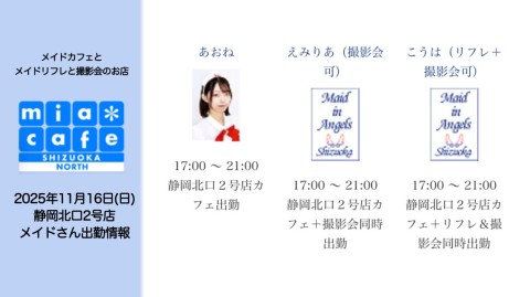 | 営業時間 | 静岡店は出勤スタッフがいれば営業です! 基本的に 12時~22時が営業時間です! ●静岡店のツイッター @shizuokamaidsan https://twitter.com/shizuokamaidsan ●ミア静岡店の営業曜日&営業時間● ☆月〜木 14:00〜22:00(最終受付20:00) ☆金曜日 12:00〜22:00(最終受付21:00) ☆土・日・祝 12:00〜22:00(最終受付21:00) 営業時間外はオンライン予約にてお願いいたします。 PC・携帯共通 → http://m-kanzume.moo.jp/yoyaku2/user.cgi ●ミアガイド出勤状況● スマホ・PC → 後日公開予定 ★静岡店スタッフによるミア甲府店でのメイドカフェリアル営業★ ☆不定期 サイトにてご確認ください。 http://market.chu.jp/schedule1/sche37.cgi | ||||||||||||||
