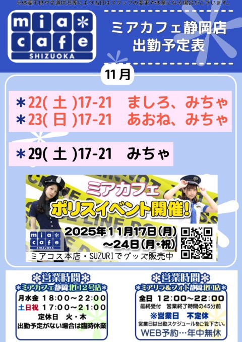 | 営業時間 | 静岡店は出勤スタッフがいれば営業です! 基本的に 12時~22時が営業時間です! ●静岡店のツイッター @shizuokamaidsan https://twitter.com/shizuokamaidsan ●ミア静岡店の営業曜日&営業時間● ☆月〜木 14:00〜22:00(最終受付20:00) ☆金曜日 12:00〜22:00(最終受付21:00) ☆土・日・祝 12:00〜22:00(最終受付21:00) 営業時間外はオンライン予約にてお願いいたします。 PC・携帯共通 → http://m-kanzume.moo.jp/yoyaku2/user.cgi ●ミアガイド出勤状況● スマホ・PC → 後日公開予定 ★静岡店スタッフによるミア甲府店でのメイドカフェリアル営業★ ☆不定期 サイトにてご確認ください。 http://market.chu.jp/schedule1/sche37.cgi | ||||||||||||||