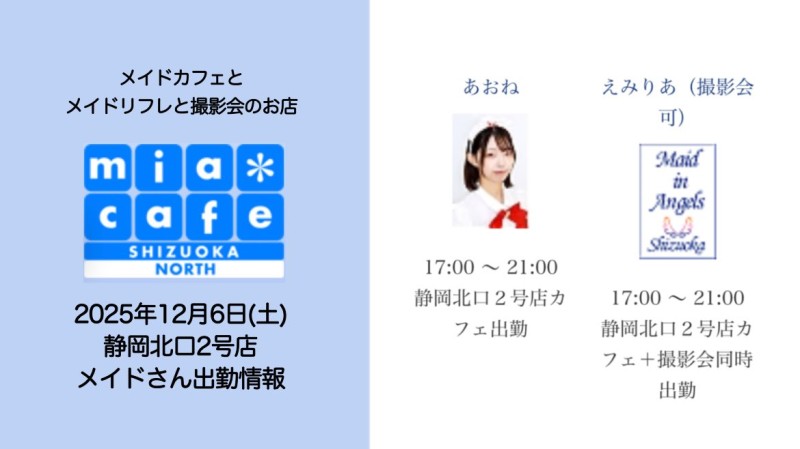 | 営業時間 | 静岡店は出勤スタッフがいれば営業です! 基本的に 12時~22時が営業時間です! ●静岡店のツイッター @shizuokamaidsan https://twitter.com/shizuokamaidsan ●ミア静岡店の営業曜日&営業時間● ☆月〜木 14:00〜22:00(最終受付20:00) ☆金曜日 12:00〜22:00(最終受付21:00) ☆土・日・祝 12:00〜22:00(最終受付21:00) 営業時間外はオンライン予約にてお願いいたします。 PC・携帯共通 → http://m-kanzume.moo.jp/yoyaku2/user.cgi ●ミアガイド出勤状況● スマホ・PC → 後日公開予定 ★静岡店スタッフによるミア甲府店でのメイドカフェリアル営業★ ☆不定期 サイトにてご確認ください。 http://market.chu.jp/schedule1/sche37.cgi | ||||||||||||||