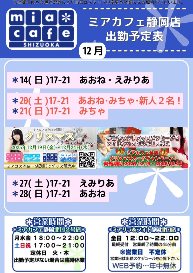 | 営業時間 | 静岡店は出勤スタッフがいれば営業です! 基本的に 12時~22時が営業時間です! ●静岡店のツイッター @shizuokamaidsan https://twitter.com/shizuokamaidsan ●ミア静岡店の営業曜日&営業時間● ☆月〜木 14:00〜22:00(最終受付20:00) ☆金曜日 12:00〜22:00(最終受付21:00) ☆土・日・祝 12:00〜22:00(最終受付21:00) 営業時間外はオンライン予約にてお願いいたします。 PC・携帯共通 → http://m-kanzume.moo.jp/yoyaku2/user.cgi ●ミアガイド出勤状況● スマホ・PC → 後日公開予定 ★静岡店スタッフによるミア甲府店でのメイドカフェリアル営業★ ☆不定期 サイトにてご確認ください。 http://market.chu.jp/schedule1/sche37.cgi | ||||||||||||||