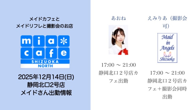 🎍#年賀状📮https://t.co/PWX10gLnN3 ★#メイドカフェ ・ミアカフェ #静岡 店★ ☕️営業予定日☕️ 💖12月14日(日) 17-21 あおね,えみりあ 🎅#クリスマス フリー #コスプレ ウィーク🎅 🎁12月20日(土) 17-21 あおね,みちゃ,🔰初回勤務 新人さん2名🔰 🎁12月21日(日) 17-21 みちゃ #コンカフェ営業 https://t.co/w1JidPome5