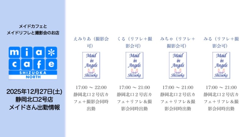 | å¶æ¥æé | é岡åºã¯åºå€ã¹ã¿ãããããã°å¶æ¥ã§ãïŒ åºæ¬çã«ã12æïœ22æãå¶æ¥æéã§ãïŒ âé岡åºã®ãã€ãã¿ãŒã@shizuokamaidsan https://twitter.com/shizuokamaidsan âãã¢é岡åºã®å¶æ¥ææ¥ïŒå¶æ¥æéâ âæãæšã14:00ã22:00(æçµåä»20:00) âéææ¥ã12:00ã22:00(æçµåä»21:00) âåã»æ¥ã»ç¥ã12:00ã22:00(æçµåä»21:00) å¶æ¥æéå€ã¯ãªã³ã©ã€ã³äºçŽã«ãŠãé¡ãããããŸãã ïŒ°ïŒ£ã»æºåž¯å ±éãâãhttp://m-kanzume.moo.jp/yoyaku2/user.cgi âãã¢ã¬ã€ãåºå€ç¶æ³â ã¹ããã»ïŒ°ïŒ£ãâãåŸæ¥å ¬éäºå® â é岡åºã¹ã¿ããã«ãããã¢ç²åºåºã§ã®ã¡ã€ãã«ãã§ãªã¢ã«å¶æ¥â âäžå®æ ããµã€ãã«ãŠã確èªãã ããã ãhttp://market.chu.jp/schedule1/sche37.cgi | ||||||||||||||
